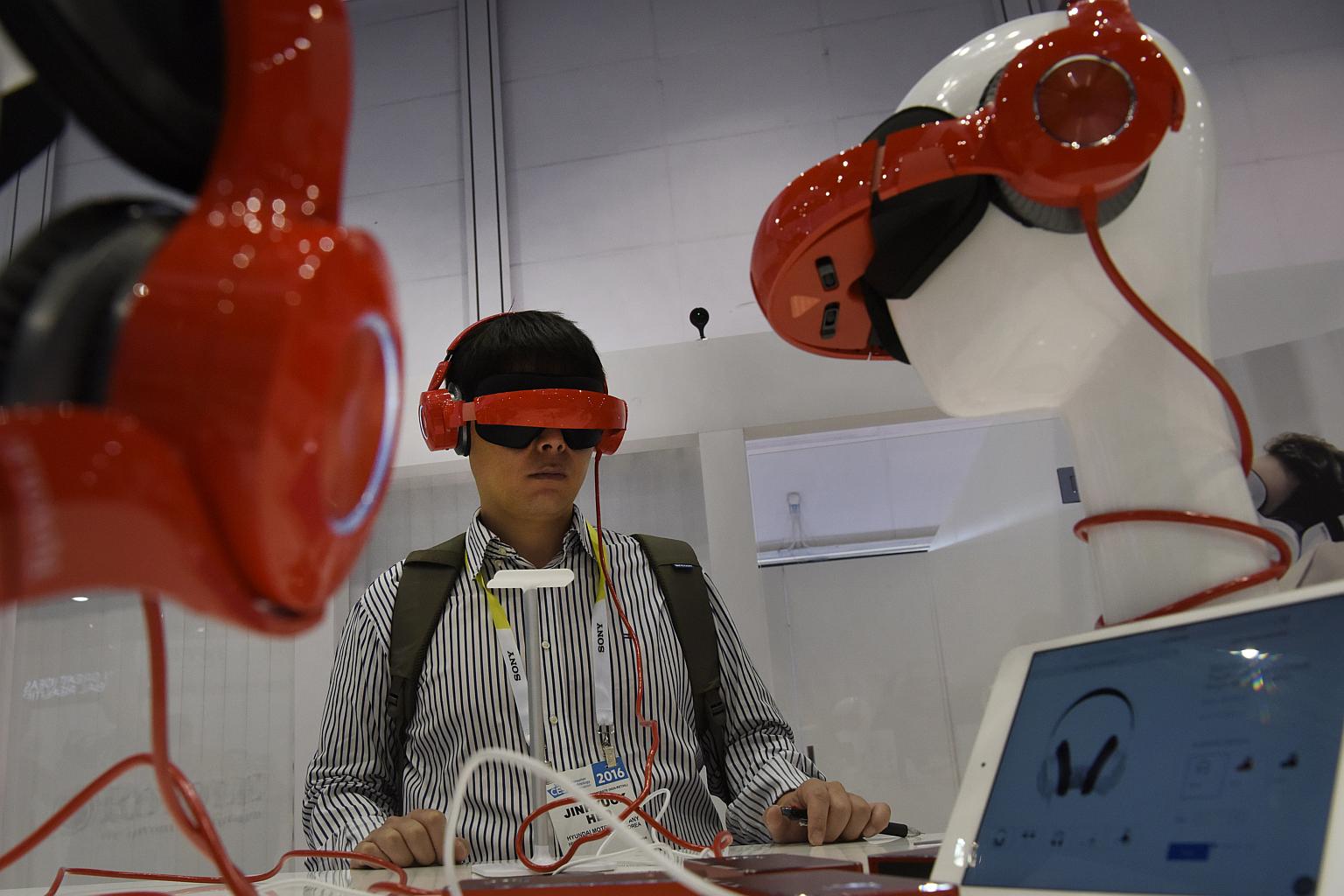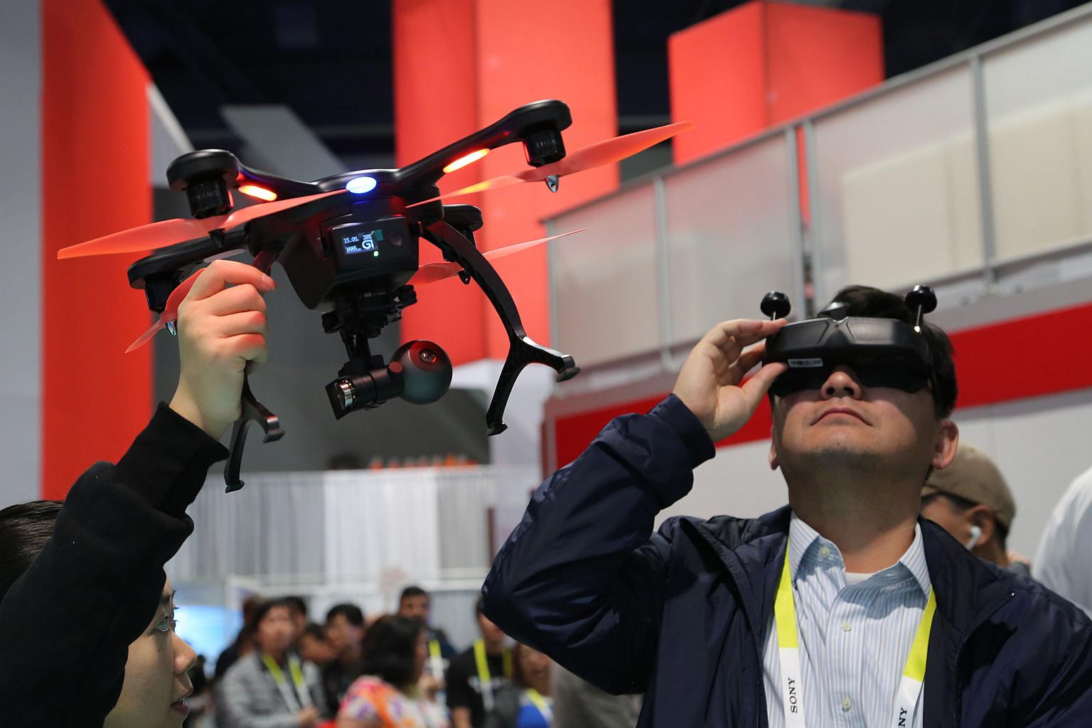 A man trying out virtual reality goggles with an EHang Ghost Drone 2.0, which has 4K video, Avatar tilt control and VR goggles at CES 2016.
