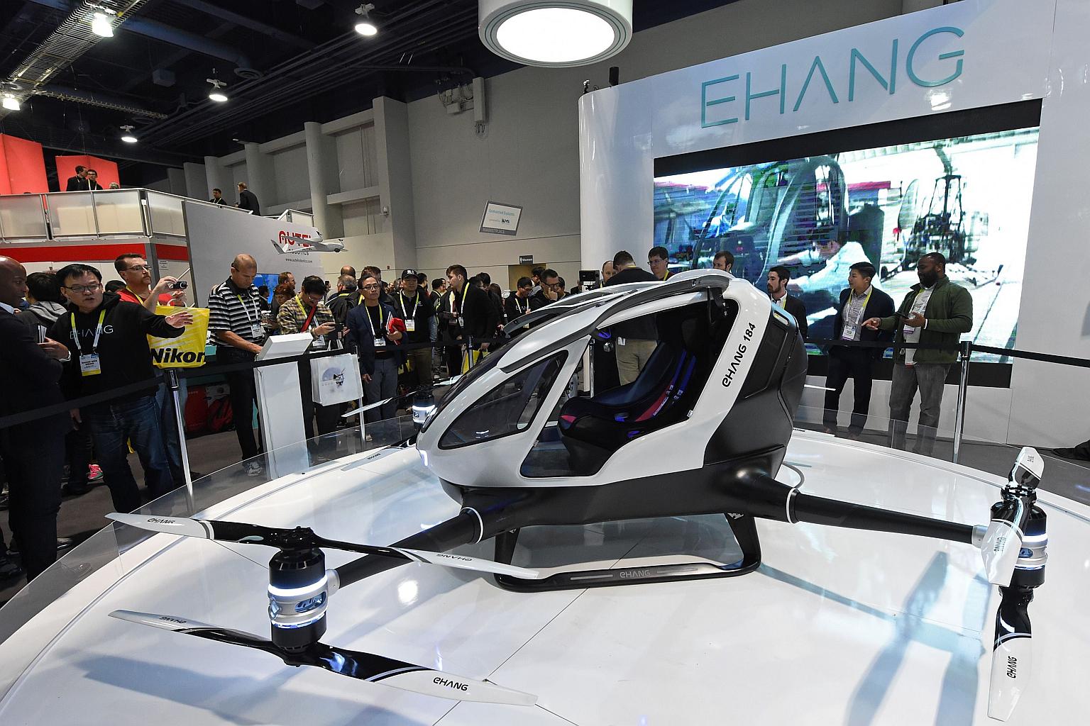 Attendees looking at an EHang 184 autonomous-flight drone that can fly a person, at CES 2016.