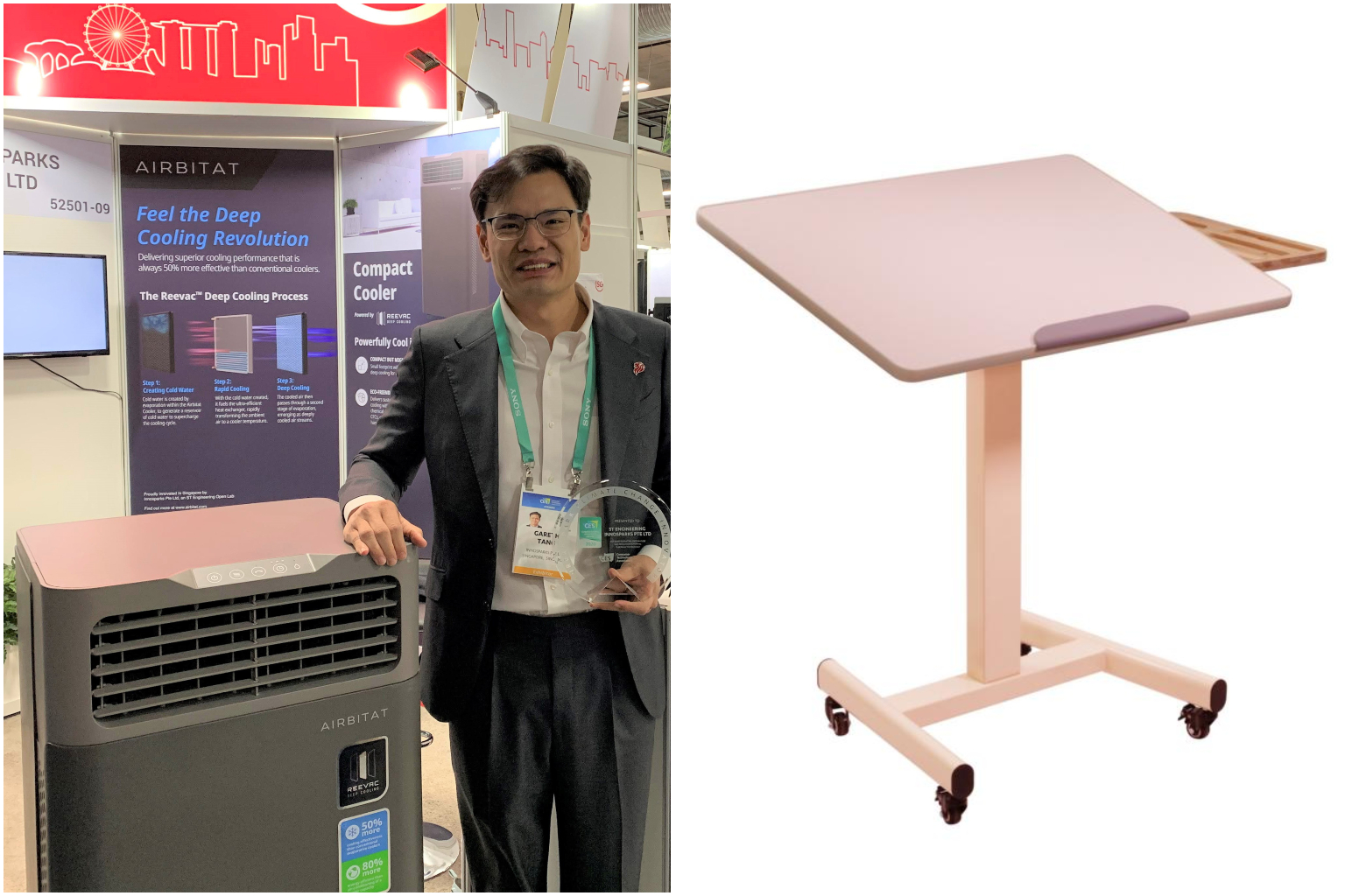 Innosparks head Gareth Tang and the Airbitat Compact Cooler at CES 2020, alongside Fitterlab's Fitterdesk.
