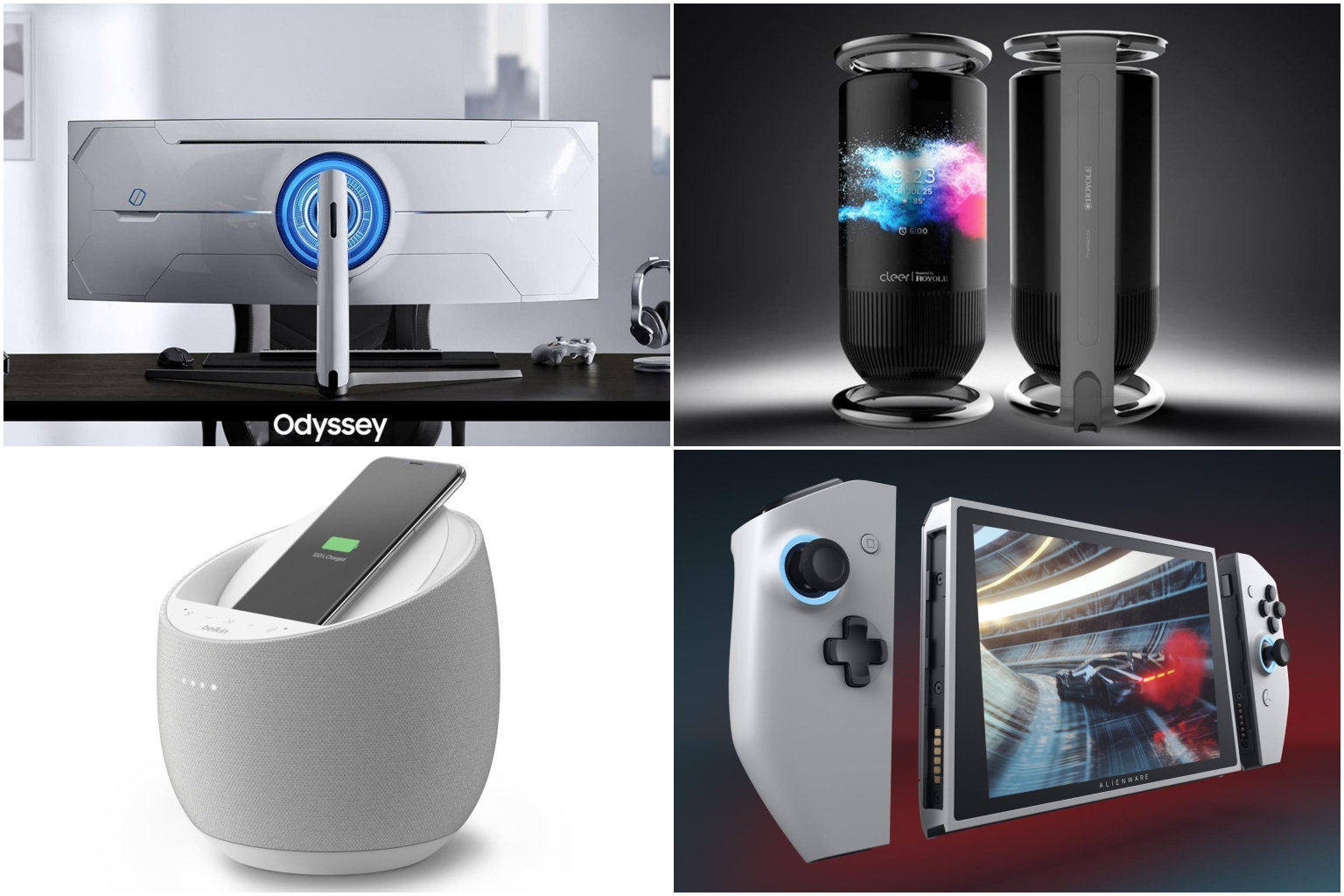 Some gadgets to look out for include (clockwise from top left) the Samsung Odyssey G9, the Royale Mirage Smart Speaker, the Alienware Concept UFO and the Belkin Soundform Elite.