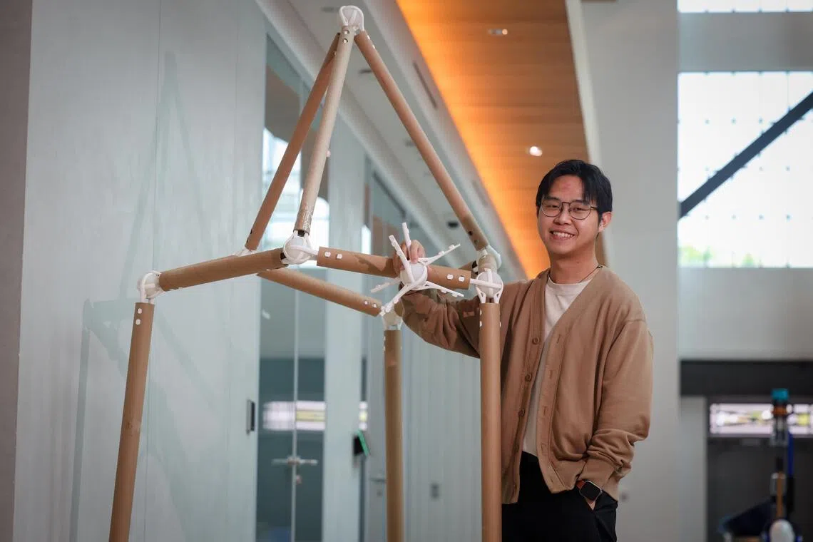 Centred around an elastic core, the stable joints can support beams of cardboard, plastic or other materials for tents or other structures of varying sizes and shapes, said inventor Reynard Seah, 27, a recent graduate of the NUS’ division of industrial design.