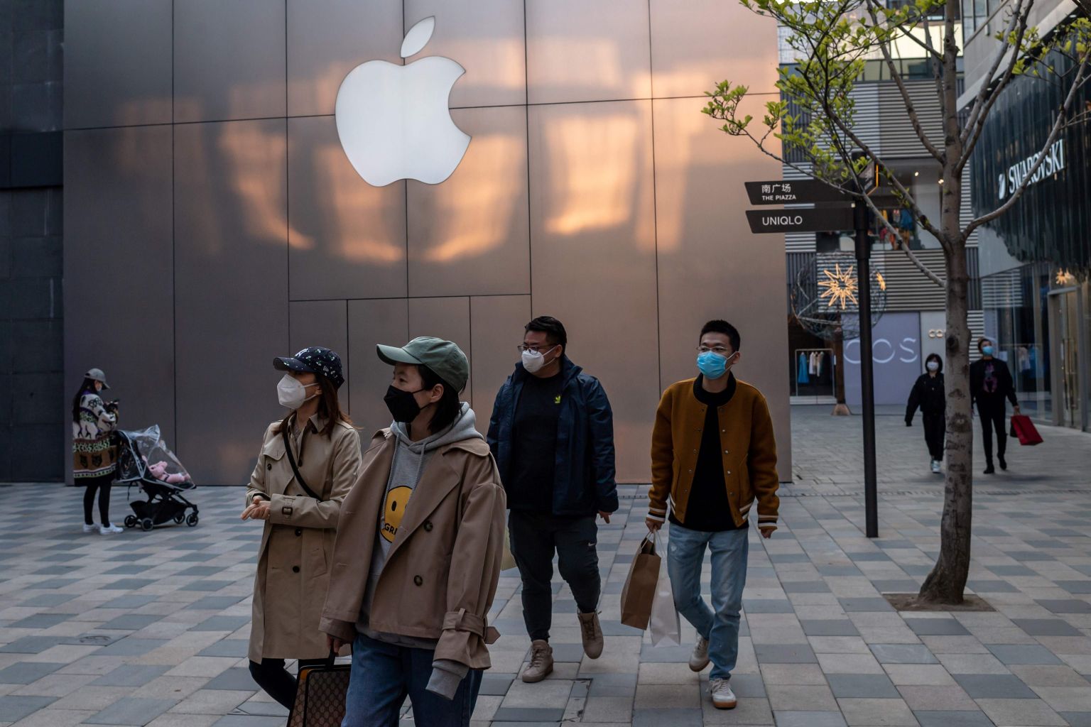People wearing face masks walk past an Apple shop (back) at a mall in Beijing on April 9, 2020.