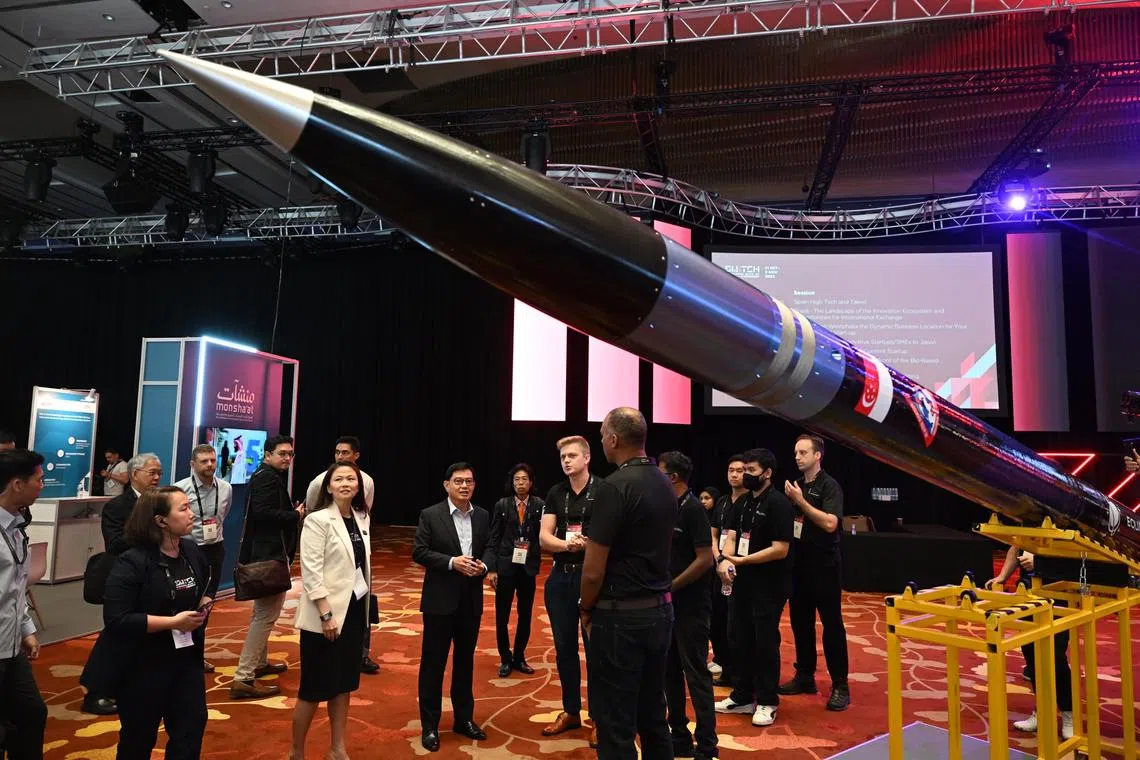 DPM Heng Swee Keat visiting a booth by Equatorial Space during a tour at the Singapore Week of Innovation and Technology on Oct 31.
