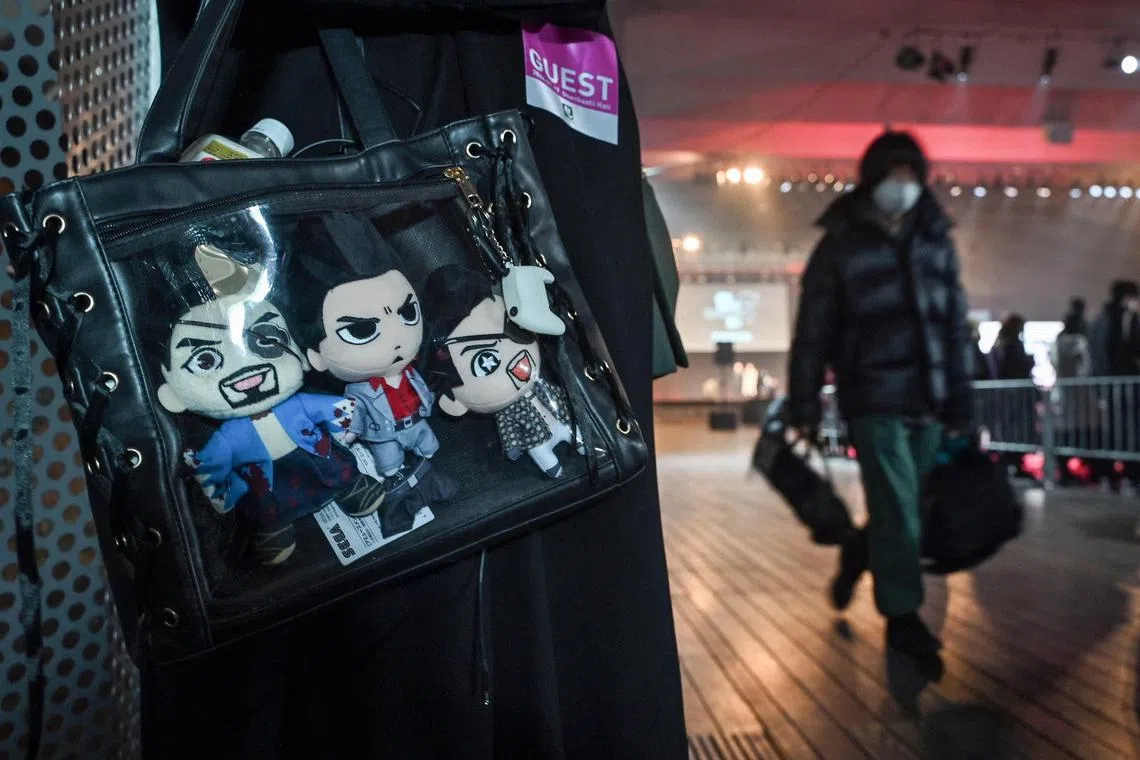 A fan holds a bag with soft toys at the end of a red carpet presentation and press conference in Yokohama, on Jan 17, 2024.