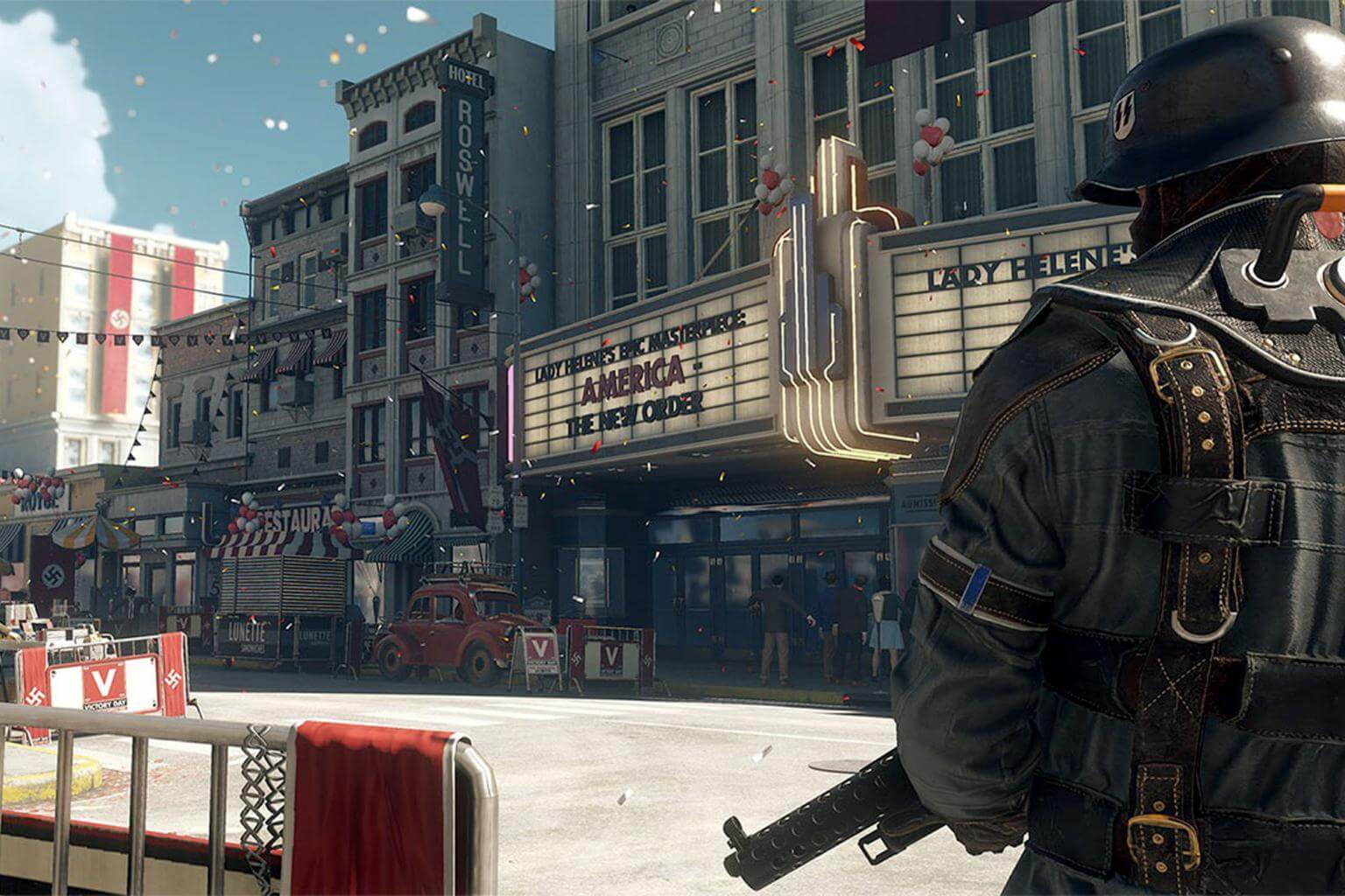 In Wolfenstein II, images of Adolf Hitler were doctored to remove his moustache and the swastika in the Nazi flag was replaced with a triangular symbol.