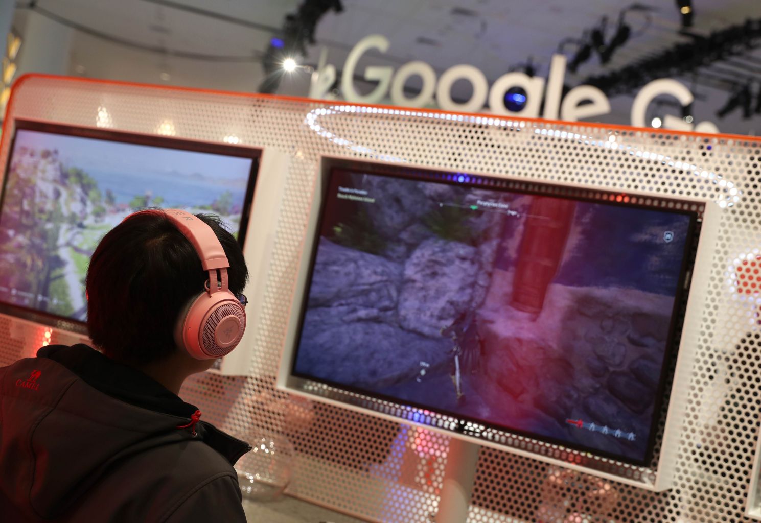 Attendees try out Google's Stadia at the Game Developers Conference in San Francisco, California.