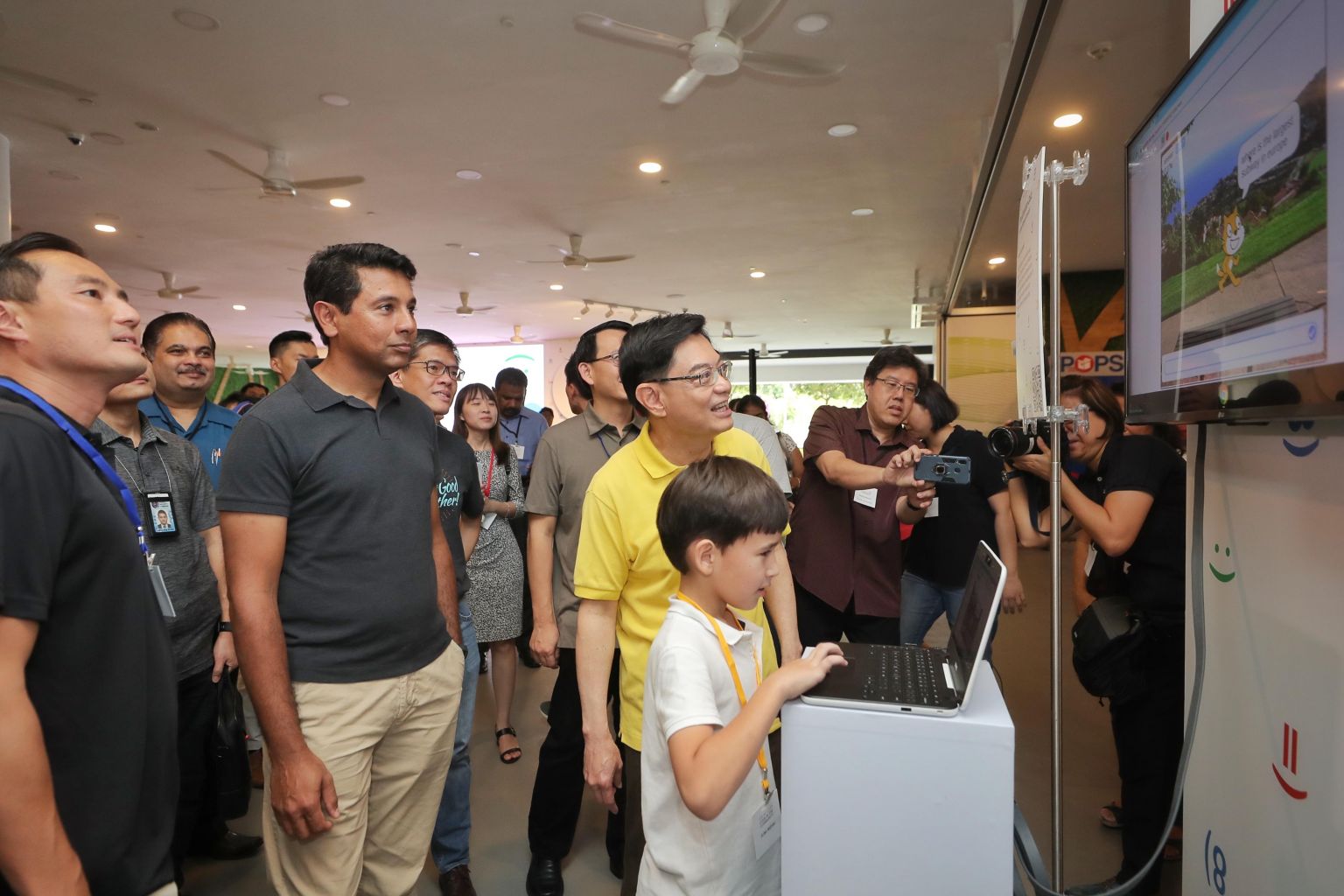 (From left) IMDA Chief Executive Tan Kiat How, Google vice-president Caesar Sengupta and Deputy Prime Minister Heng Swee Keat view Aiden McEwan’s Five Question Quiz project at the Code in the Community graduation ceremony at Our Tampines Hub on Jan 4, 2020.