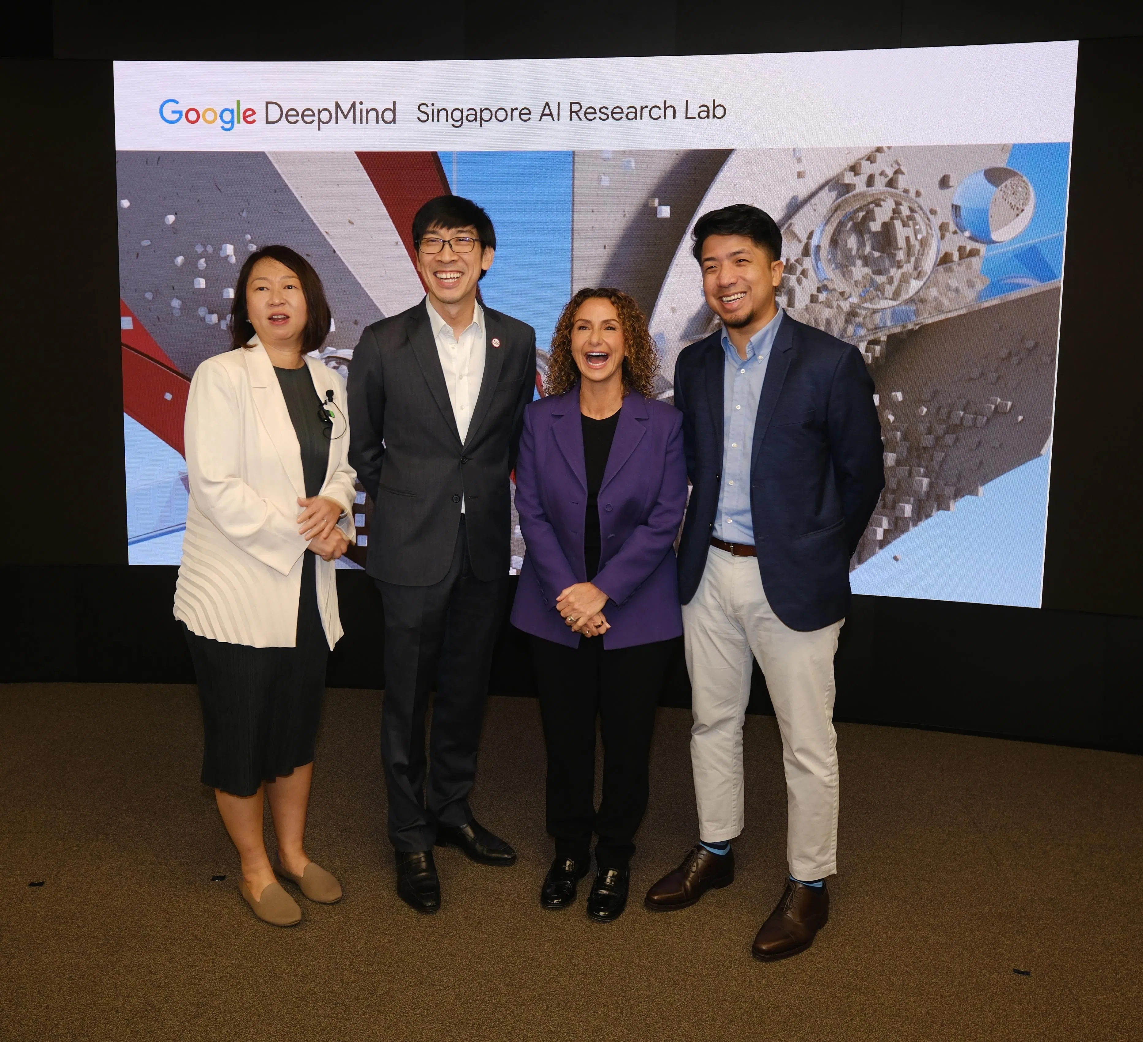 (From left) Ms Yolyn Ang, vice-president of Google’s knowledge and information partnerships team in the Asia-Pacific; EDB executive vice-president Chan Ih-Ming; Google DeepMind chief operating officer Lila Ibrahim; and Mr Mark Pereira, AI Singapore’s head of partnerships, strategy and growth; at the new Google DeepMind lab.