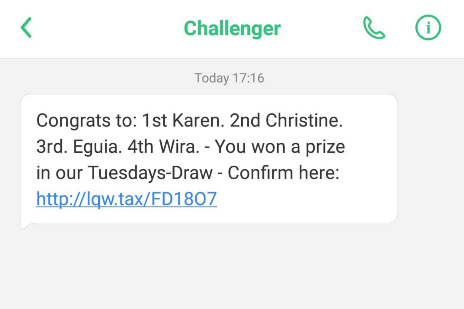 In Challenger's case, it involves an SMS sent to its customers that falsely claims they had won a mobile phone in a contest. The customers are then led to a website where they are asked to key in their credit card details to pay for a processing fee.