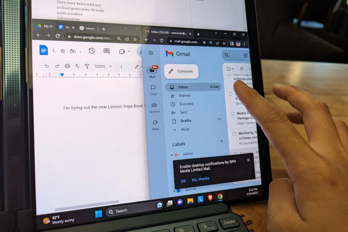 With Google Docs on my left and my references displayed in full screen on the right, it was a joy to write on the Yoga Book 9i as I didn’t have to constantly switch between tabs.
