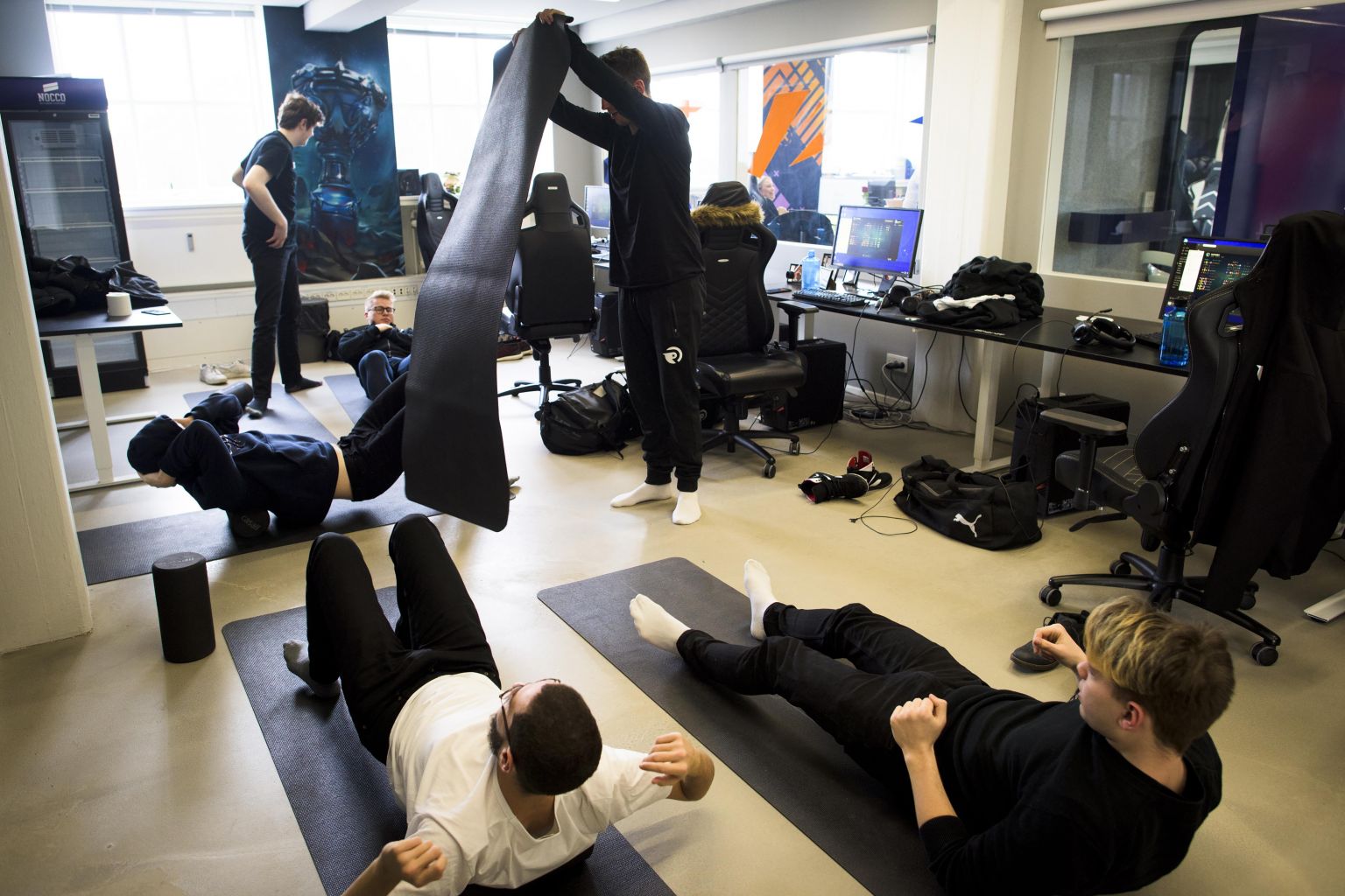 Mikkel Hjuler, a trainer who works with Danish Olympians, guided the team through some gaming-specific exercises. He had the players wrap their fists inside elastic bands and flex their fingers. He taught them a neck exercise favoured by boxers.