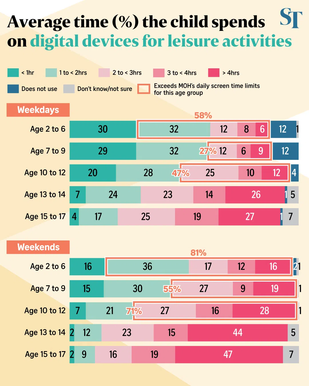 This figure balloons to 81 per cent on weekends, according to the findings of an inaugural Ministry of Digital Development and Information (MDDI) survey released on Sept 12.