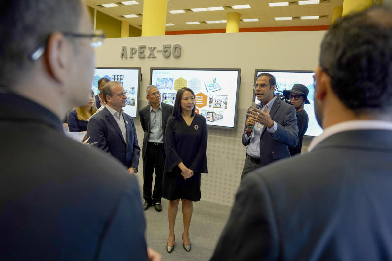 (From right) Nanyang Polytechnic's Deputy Director (Digital Engineering) Vinn Prabhu giving a tour at the launch of the NYP-StarHub Application & Experience Centre for 5G, alongside Nanyang Polytechnic Principal and CEO Jeanne Liew and StarHub chief executive Peter Kaliaropoulos.
