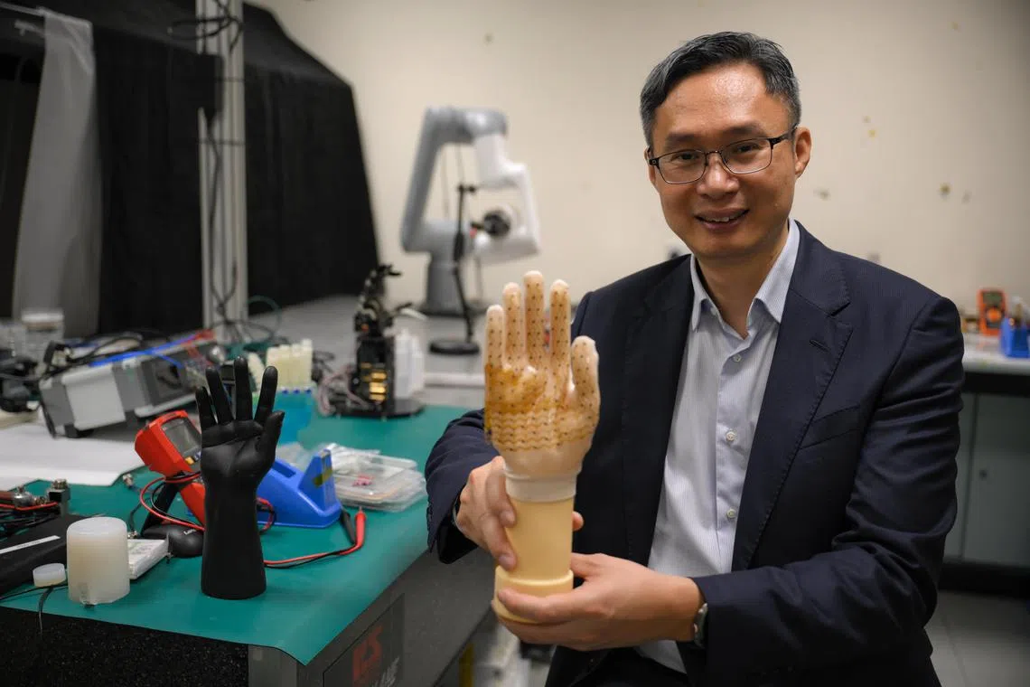Professor Chen Xiaodong with a prototype of the smart glove, which is equipped with soft sensors.