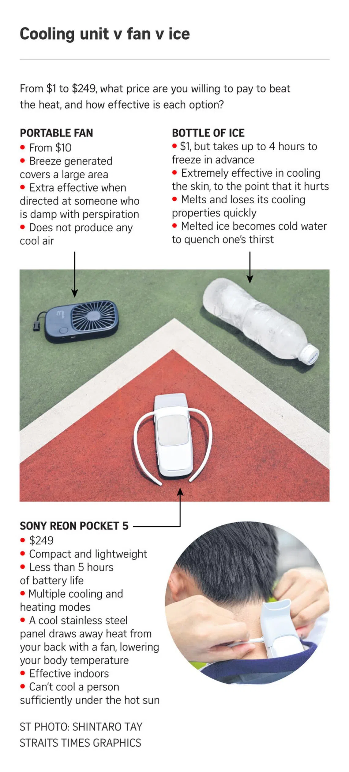 The Straits Times puts bottles of ice-cold water, a roughly $10 portable fan and the Sony gadget to the test by taking each item out for a 1km walk in the afternoon sun.