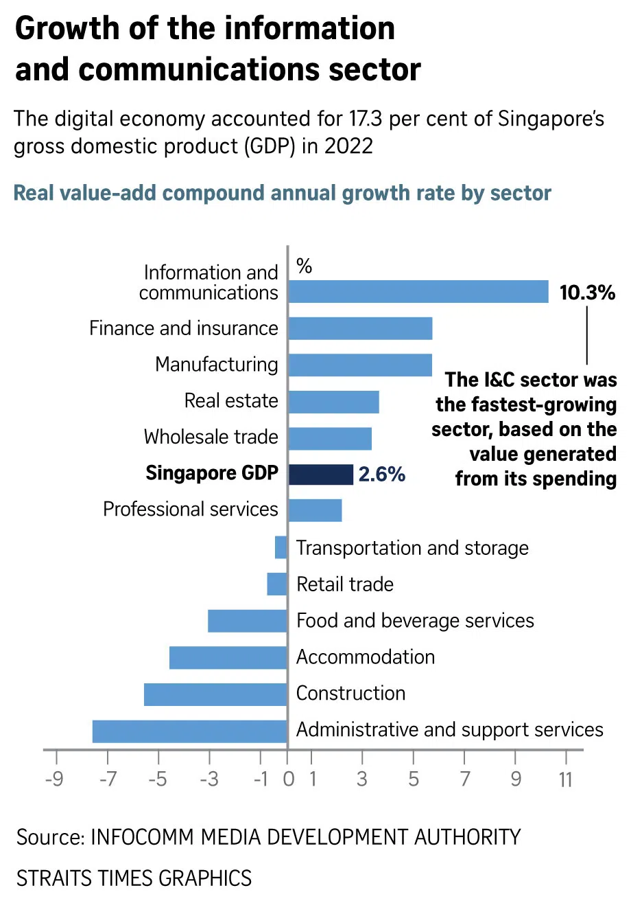 The I&C sector alone contributed to 5.4 per cent of Singapore’s GDP in 2022. It also accounted for a third of Singapore’s digital economy and is the fastest-growing sector, reflecting Singapore’s position as a global electronics manufacturing hub, said the report.