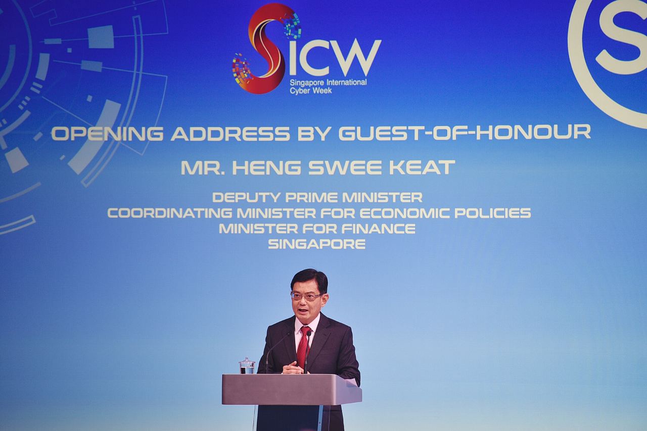 DPM Heng Swee Keat delivering the opening address at the Singapore International Cyber Week, on Oct 6, 2020.
