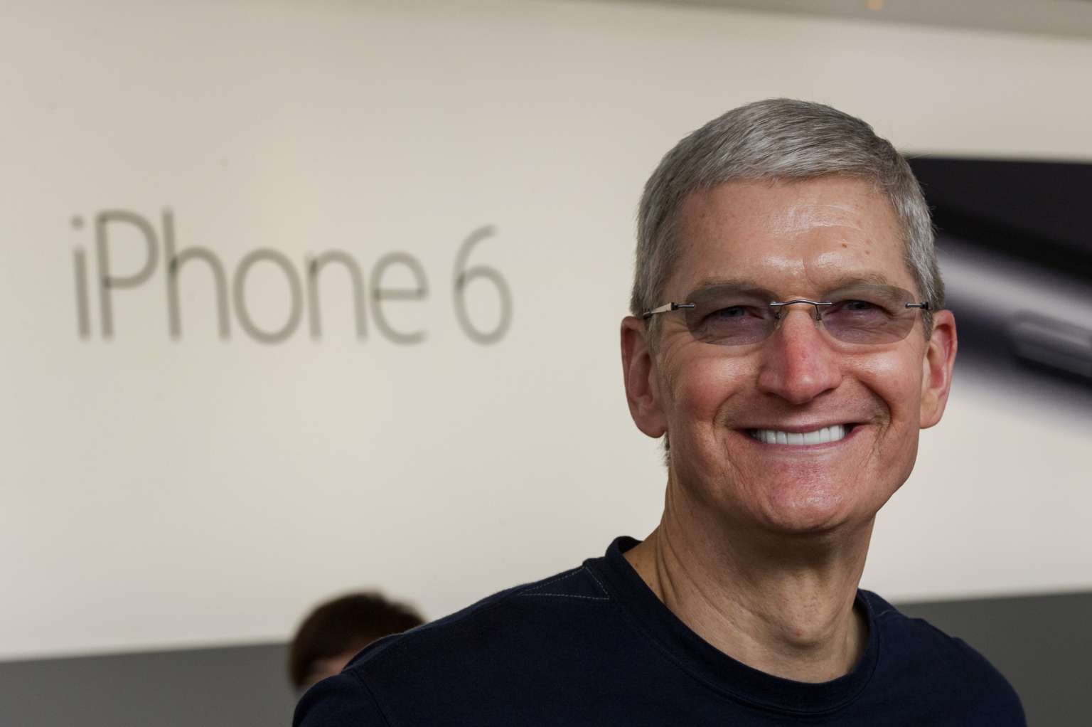 Tim Cook, chief executive officer of Apple Inc., stands for a photograph during the sales launch for the iPhone 6 and iPhone 6 Plus at the Apple Inc. store in Palo Alto, California, United States, on Friday, Sept 19, 2014.