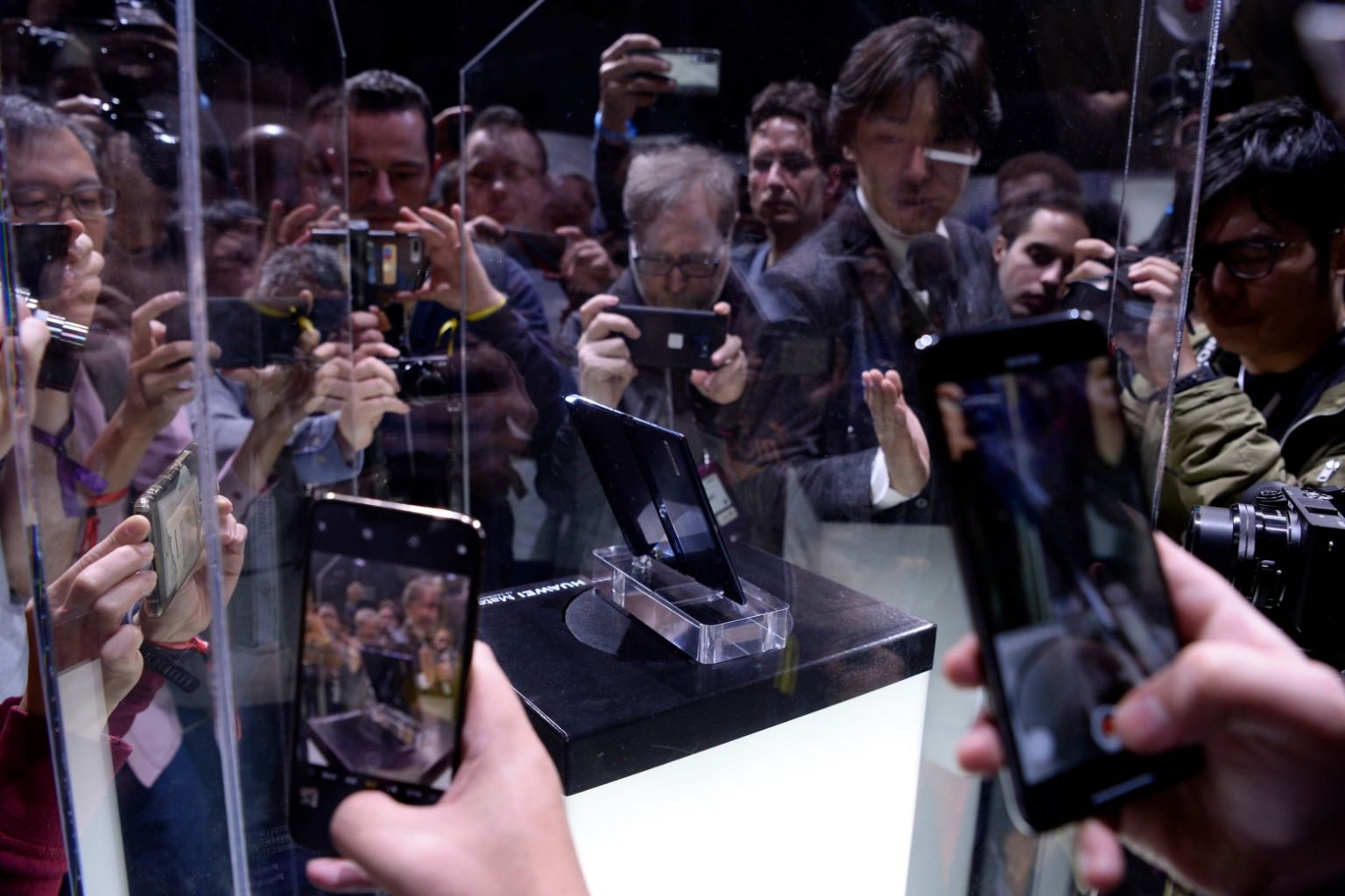 Visitors taking photos of Huawei's new foldable 5G smartphone, the Mate X, at the Mobile World Congress, on Feb 24, 2019, in Barcelona.