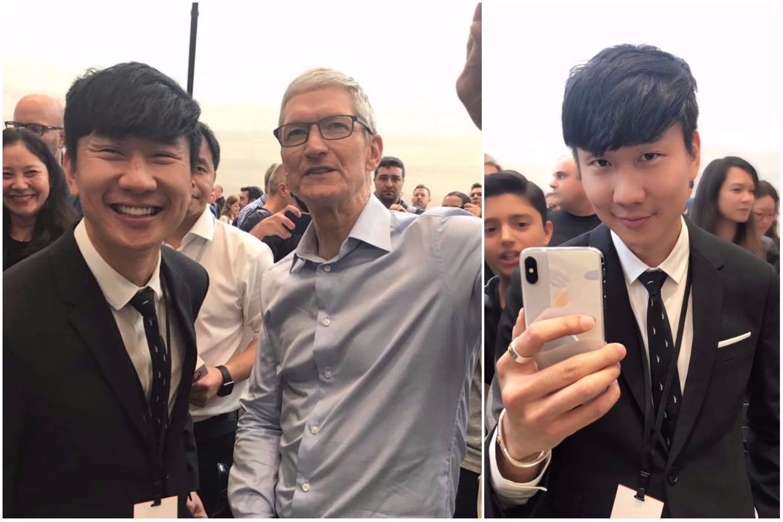 Singapore singer JJ Lin chatting with Apple CEO Tim Cook and taking a selfie with the new iPhone X.