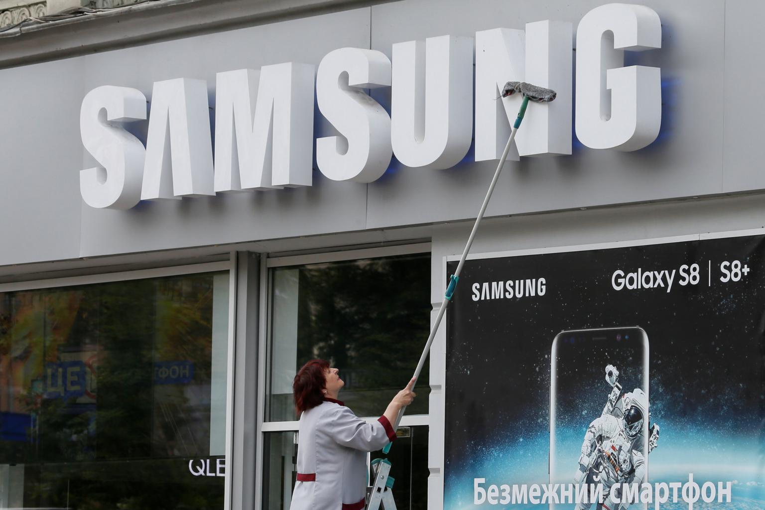 An employee cleans the corporate logo of South Korea's Samsung Electronics at its store in central Kiev