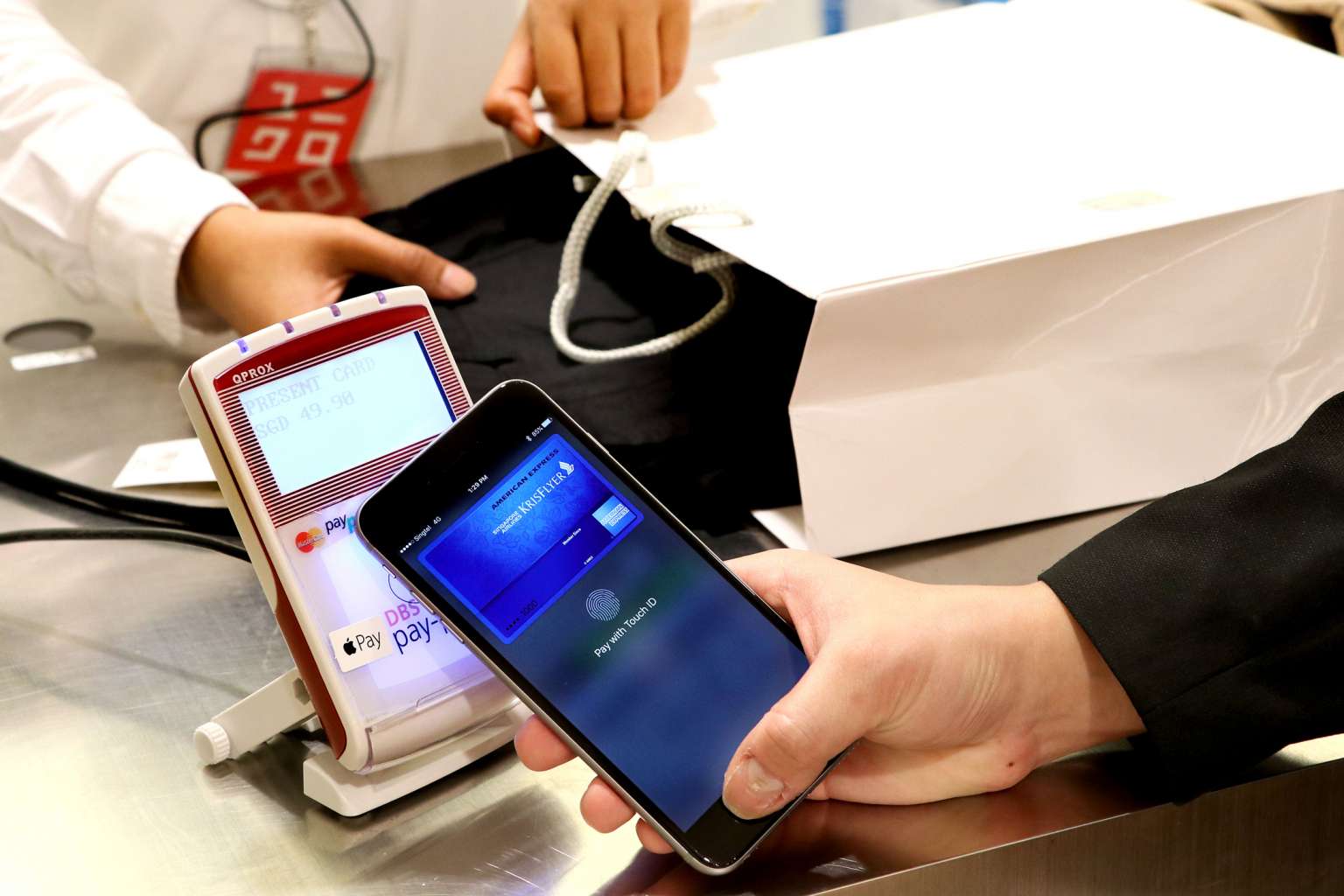 To pay, hold the phone close to the contactless reader. Place your finger on the iPhone's or iPad's fingerprint sensor as your fingerprint is needed to authenticate every transaction.