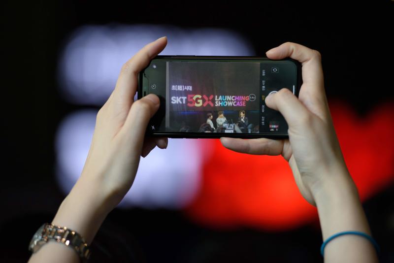 An audience member takes a photo during an SK Telecom launch event for the company's 5G mobile network, in Seoul on April 3, 2019.
