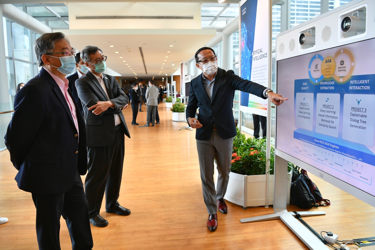 Mr Gan Kim Yong (far left) being shown a presentation titled Artificial Intelligence for Customer Service Automation at the Cisco-NUS lab on Nov 5, 2021.