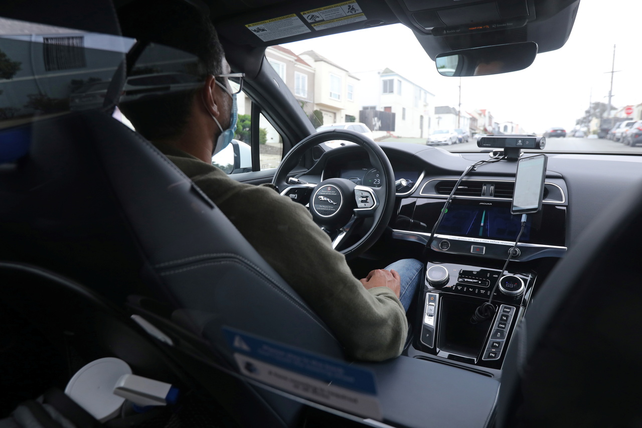 A safety operator sitting behind the wheel of a self-driving Waymo vehicle in San Francisco.