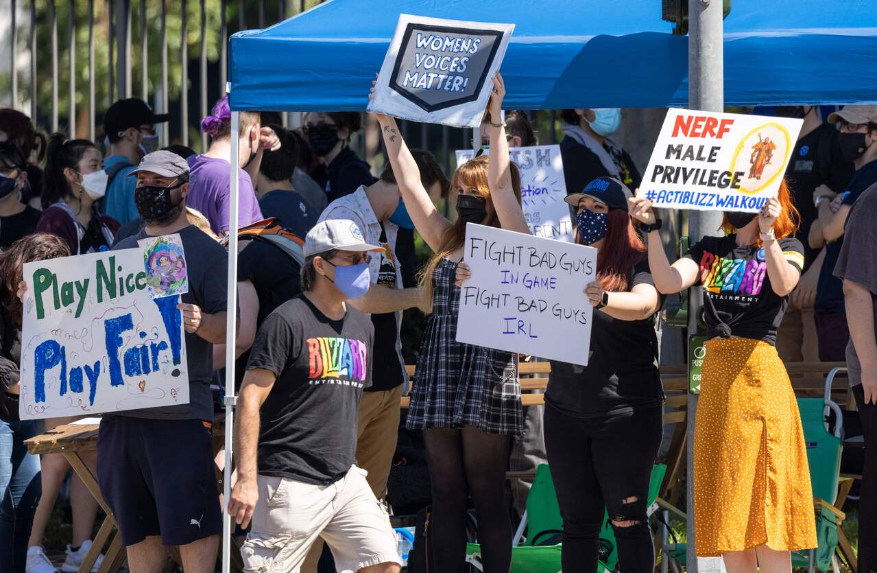 Employees of Activision Blizzard at a walkout and protest rally in Los Angeles on July 28, 2021.