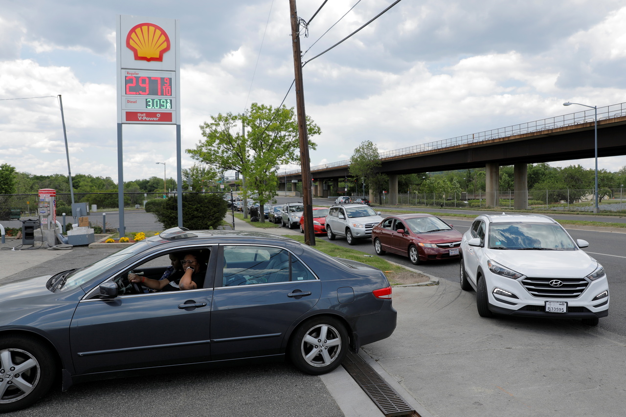 Cars queueing as they wait to refuel at a Shell petrol station in Washington, after ransomware crippled Colonial Pipeline last month.