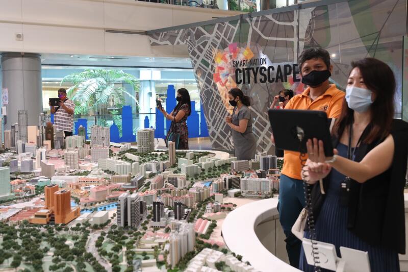 Smart Nation ambassadors using augmented reality technology to view a model of Singapore’s city area at The URA Centre on March 11, 2021.