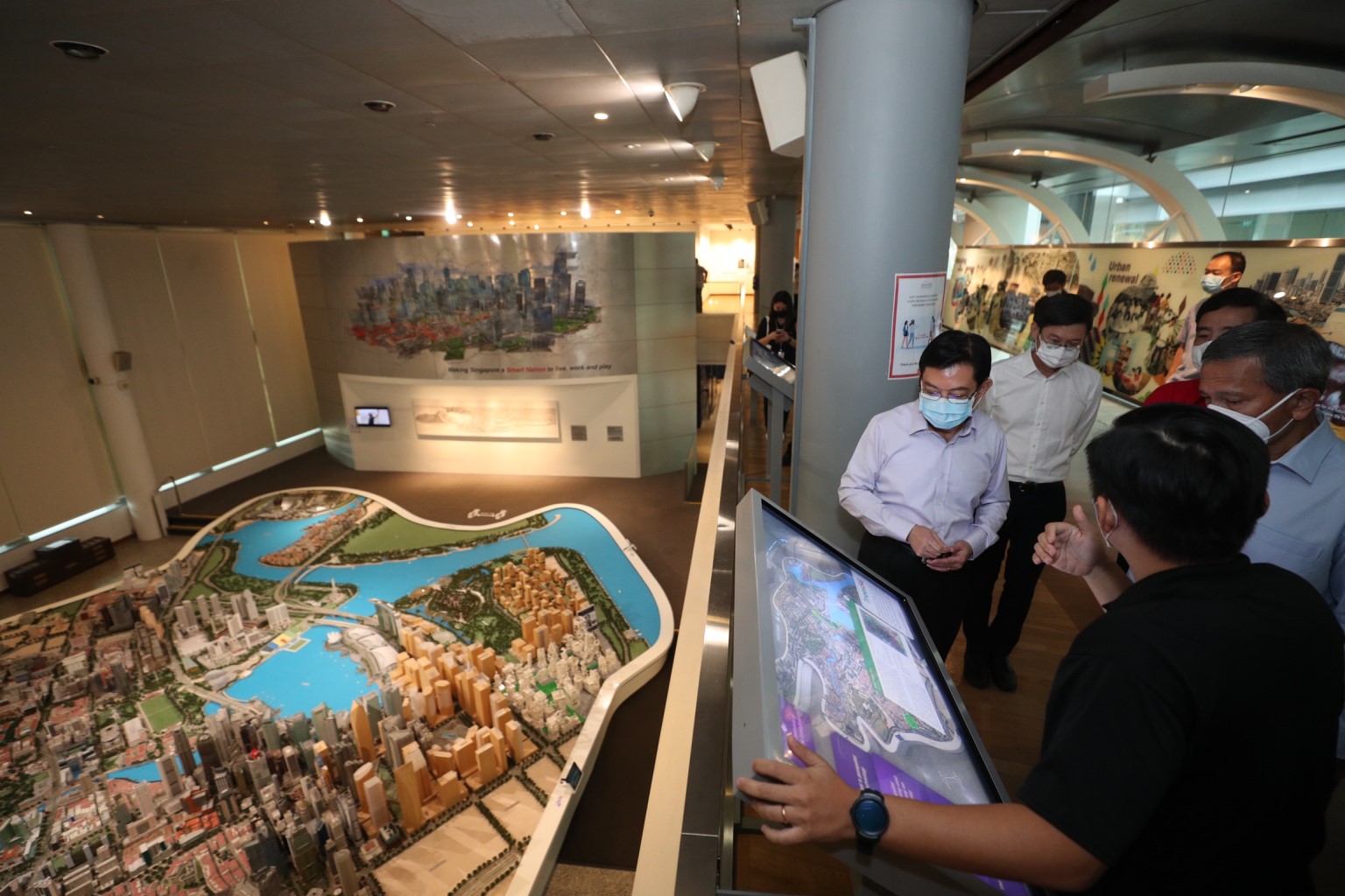 (From left) Deputy Prime Minister Heng Swee Keat touring the Smart Nation CityScape showcase at The URA Centre yesterday with Urban Redevelopment Authority chief executive Lim Eng Hwee, Senior Minister of State for Defence Heng Chee How (in red, partially hidden) and Minister-in-charge of the Smart Nation Initiative Vivian Balakrishnan. DPM Heng said Singapore must ensure that its workers are ready for the digital world.