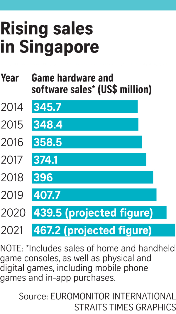 Sales of game consoles and games in Singapore are forecast to have risen 7.8 per cent last year from 2019 to hit US$439.5 million (S$592.5 million), according to market research firm Euromonitor International.