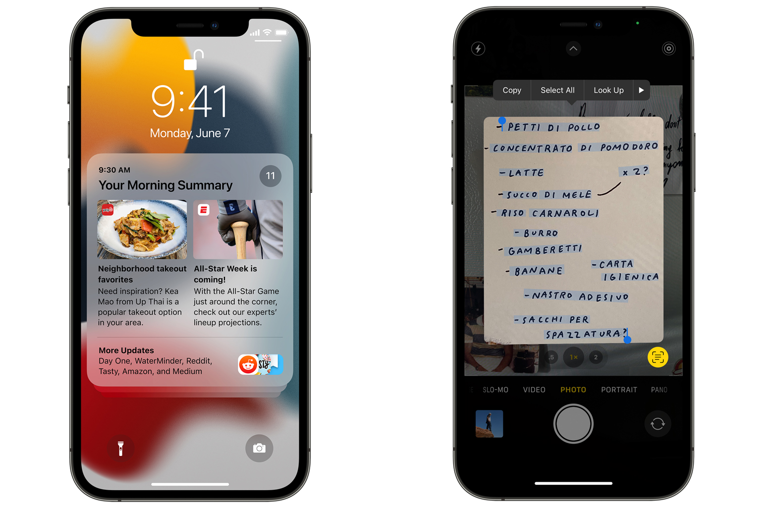 The Notification Summary feature in Apple's iOS 15 (left) and the new Live Text feature that allows the user to transcribe and copy text from images to paste into another app.