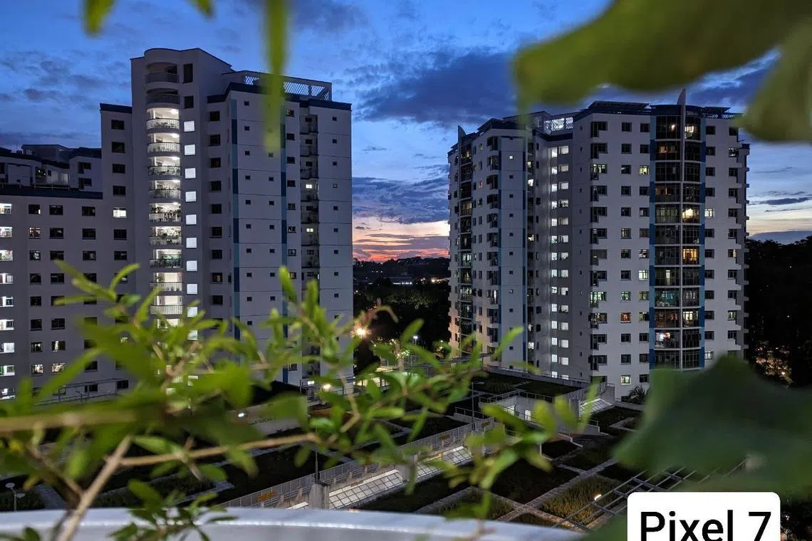 Photo of a housing estate taken on a Google Pixel 7 in the evening.