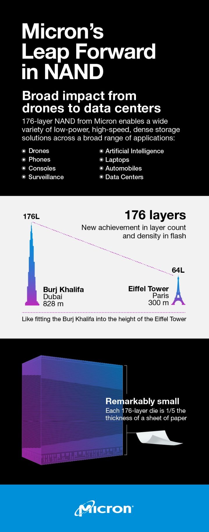 Micron also offers a wide range of storage solutions built on a foundation of its breakthrough 176-layer NAND technology, which started volume shipments in November last year. This NAND stacks memory cells vertically in multiple layers so that more data can be stored in less space. The 176-layer NAND serves as an essential storage building block for a broad array of industries from the edge to the cloud, including mobile, automotive, client and data centre markets.