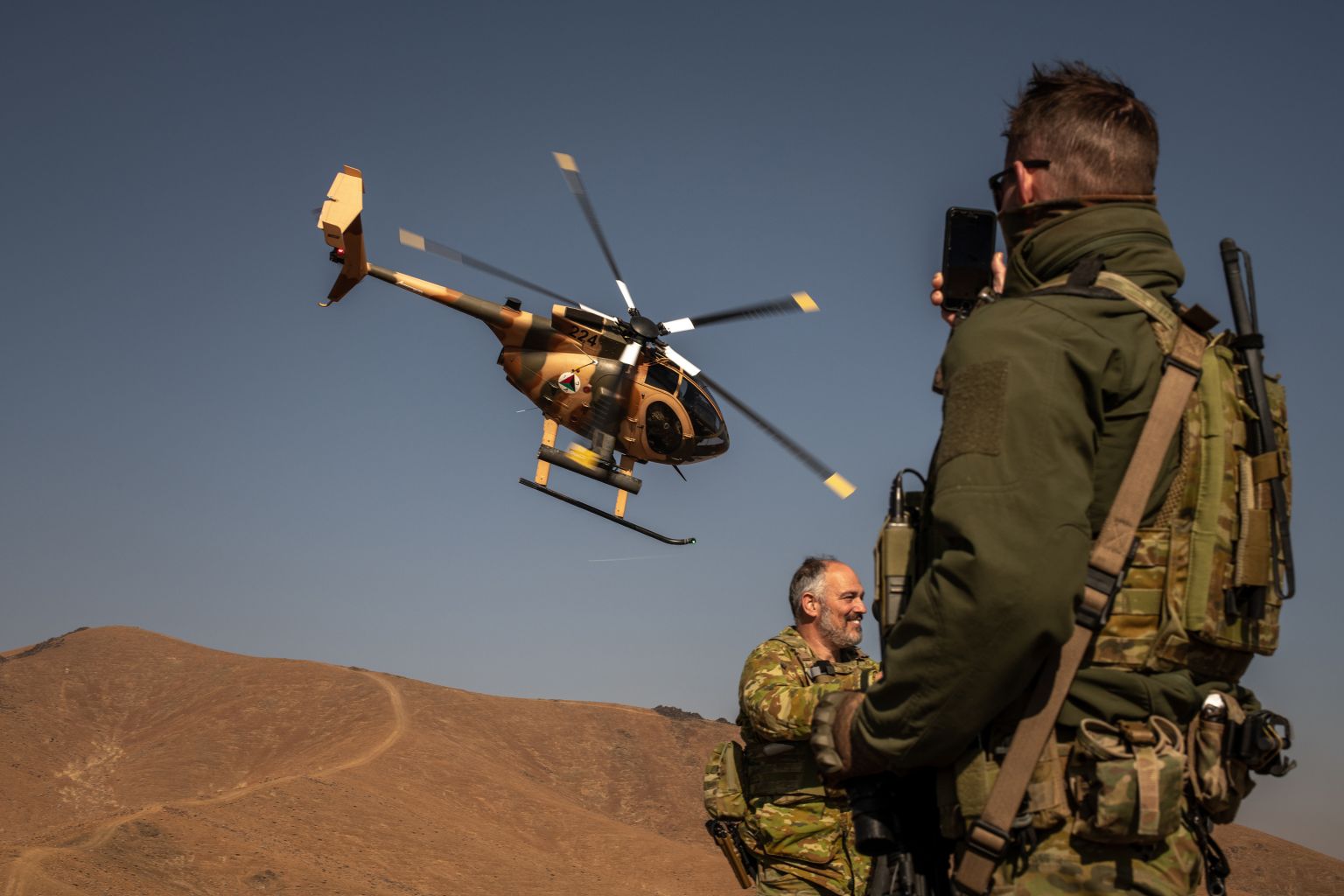 US coalition troops watch from an observation point as an MD 530 attack helicopter swoops low following a training exercise at an Afghan military weapons range in 2018.