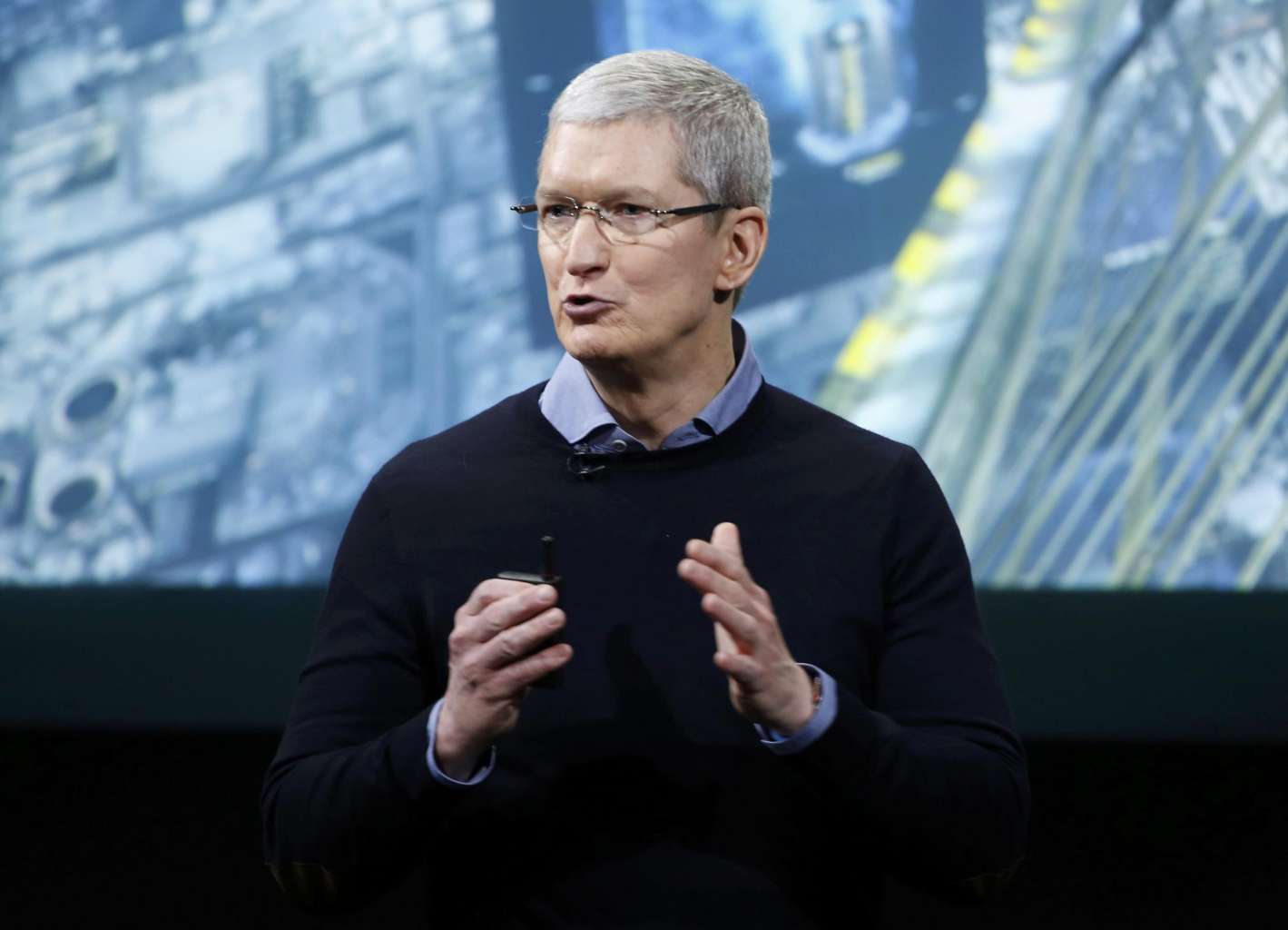 Apple CEO Tim Cook speaking during an event at the tech giant's headquarters in Cupertino, California, on March 21.