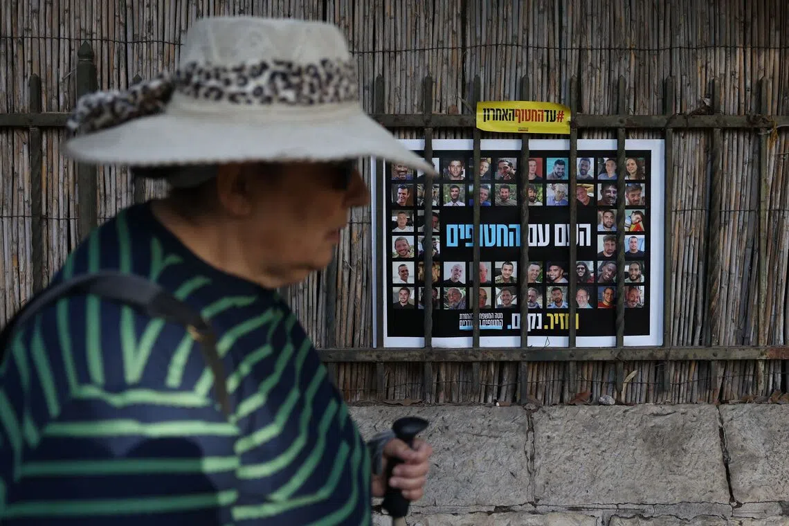 A woman walking past a poster bearing portraits of Israeli hostages in central Jerusalem on Sept 28.