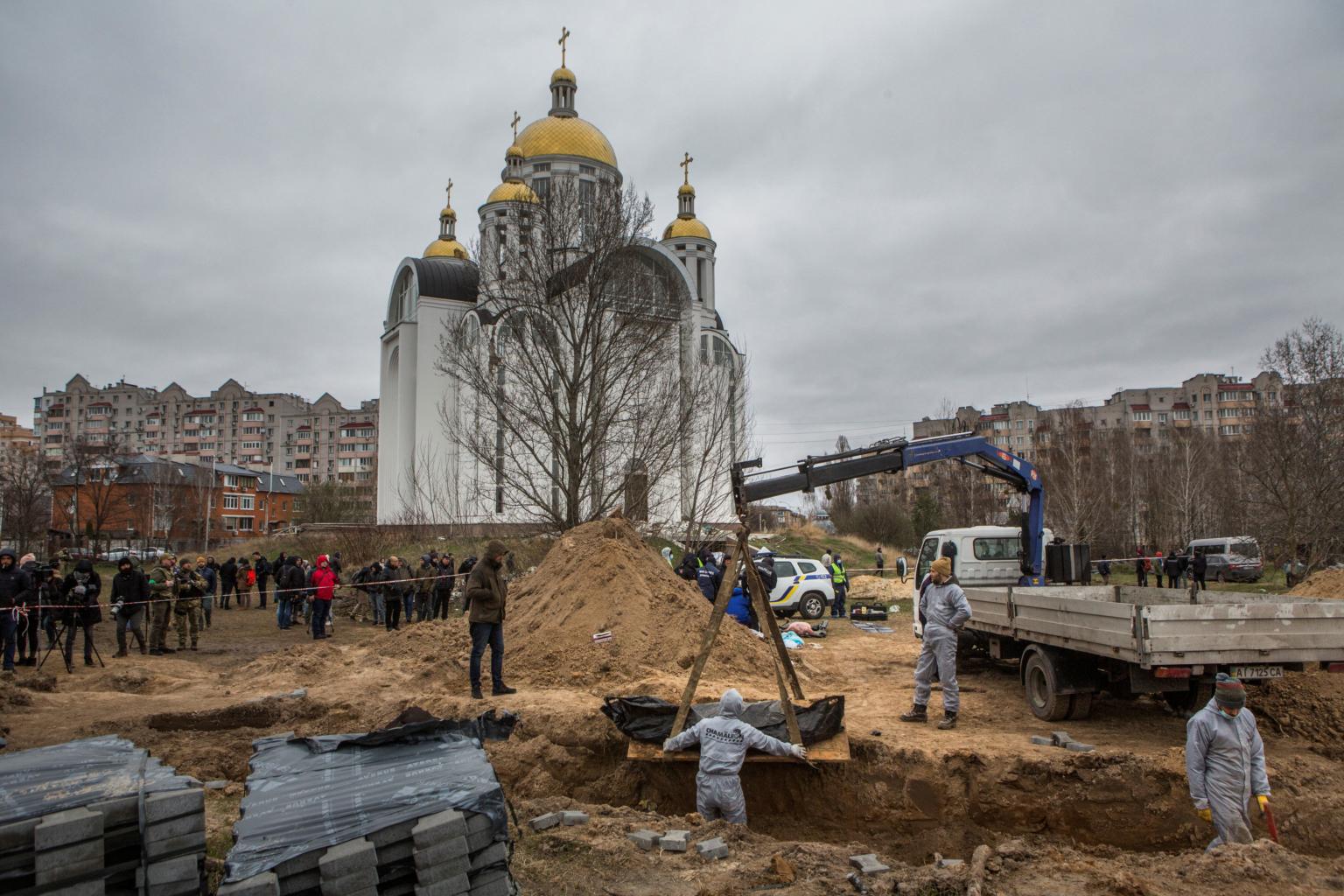 Bodies of dead civilians are exhumed from a mass grave in the town of Bucha, outside Kyiv, Ukraine, on April 13, 2022.
