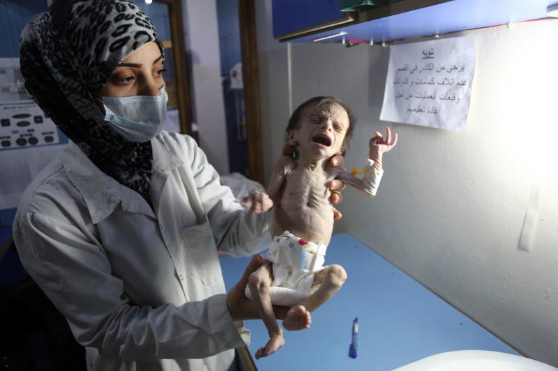 A Syrian infant suffering from severe malnutrition is carried by a nurse at a clinic in the rebel-controlled town of Hamouria, in the eastern Ghouta region on the outskirts of the capital Damascus, on Oct 21, 2017.