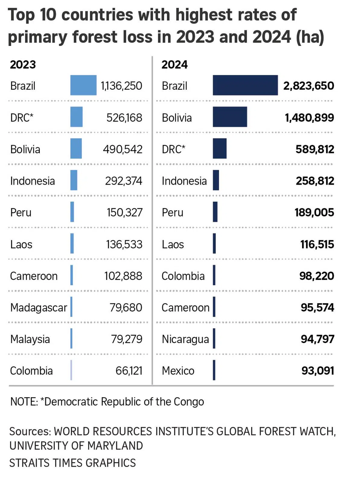Bolivia came in second with primary forest loss jumping by 201 per cent in 2024 to 1.48 million ha, with nearly two-thirds of it due to fires, which were mostly started to clear land for industrial-scale farming.