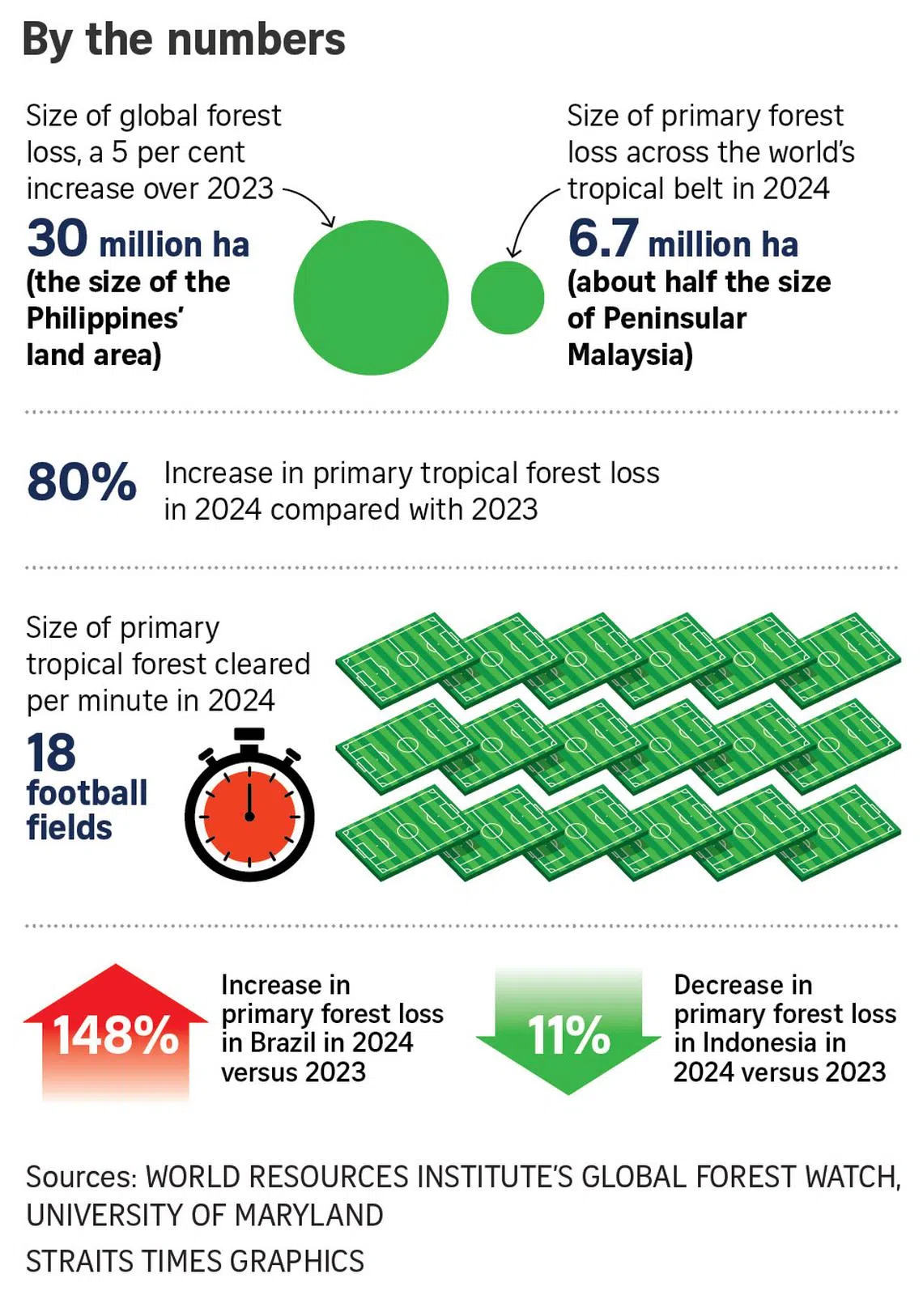 “The 2024 numbers must be a wake-up call to every country, every bank, every international business. Continuing down this path will devastate economies, people’s jobs and any chance of staving off climate change’s worst effects,” said Ms Elizabeth Goldman, a senior researcher at Global Forest Watch, during a media briefing for the study.