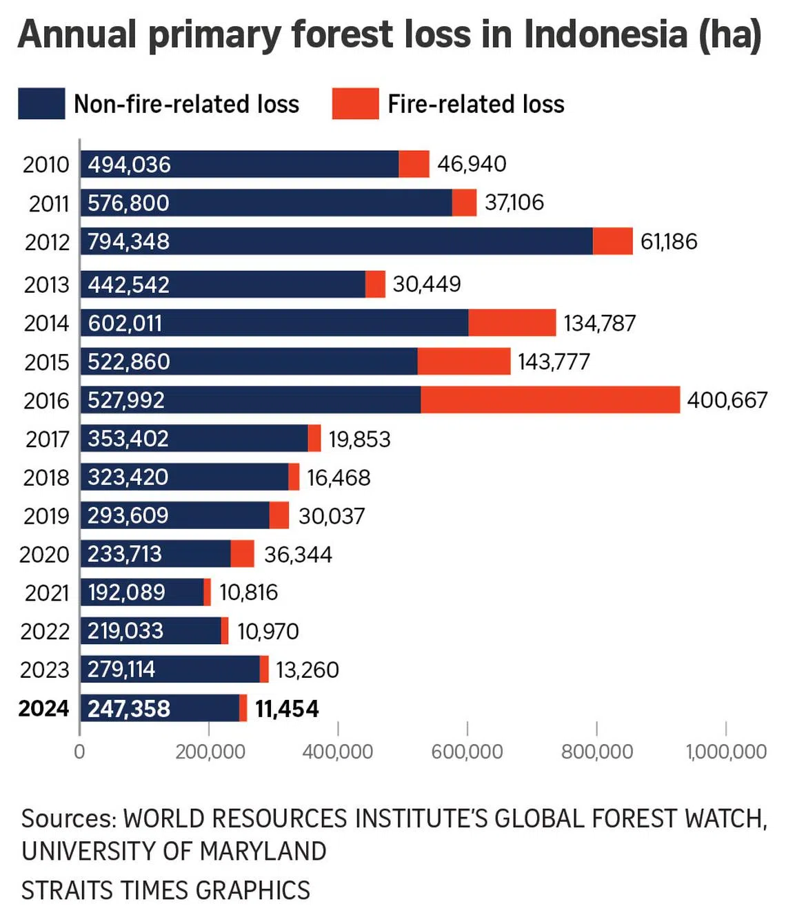 But primary forest loss fell in Malaysia in 2024, dipping 13 per cent to 68,851ha, an area slightly smaller than Singapore. In Indonesia, primary forest loss fell by 11 per cent from 2023 to 258,812ha.