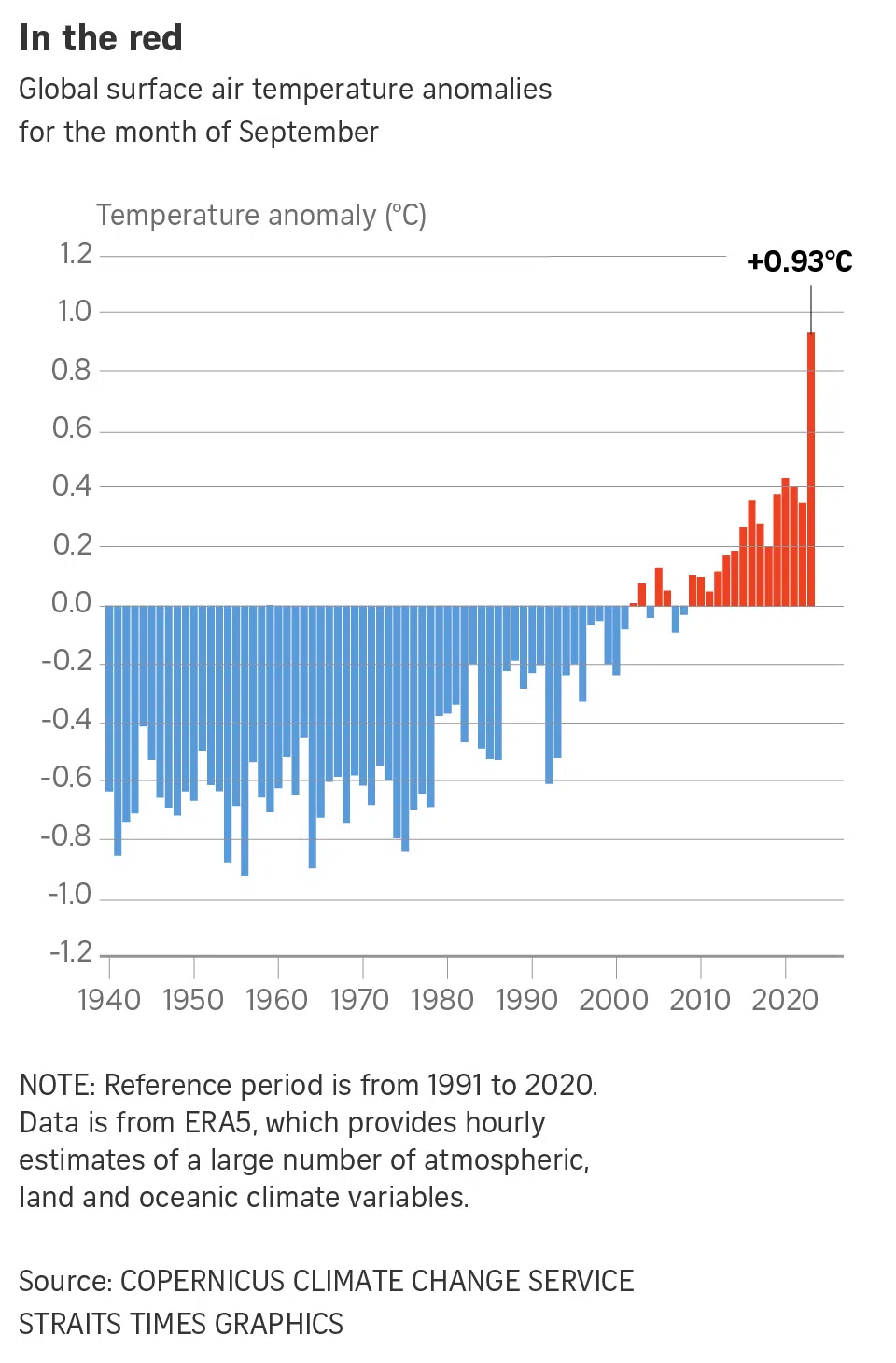 The report said the figure was “the most anomalous warm month” in its dataset going back to 1940 and around 1.75 deg C hotter than the September average in the 1850 to 1900 pre-industrial period.