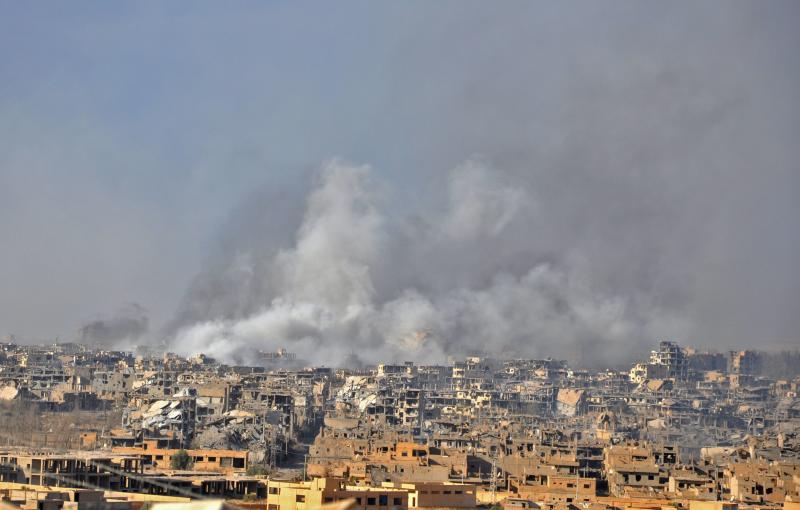 Smoke rising from buildings following an air strike by Syrian government forces in the eastern city of Deir Ezzor, on Oct 31, 2017, during an operation against ISIS group militants.