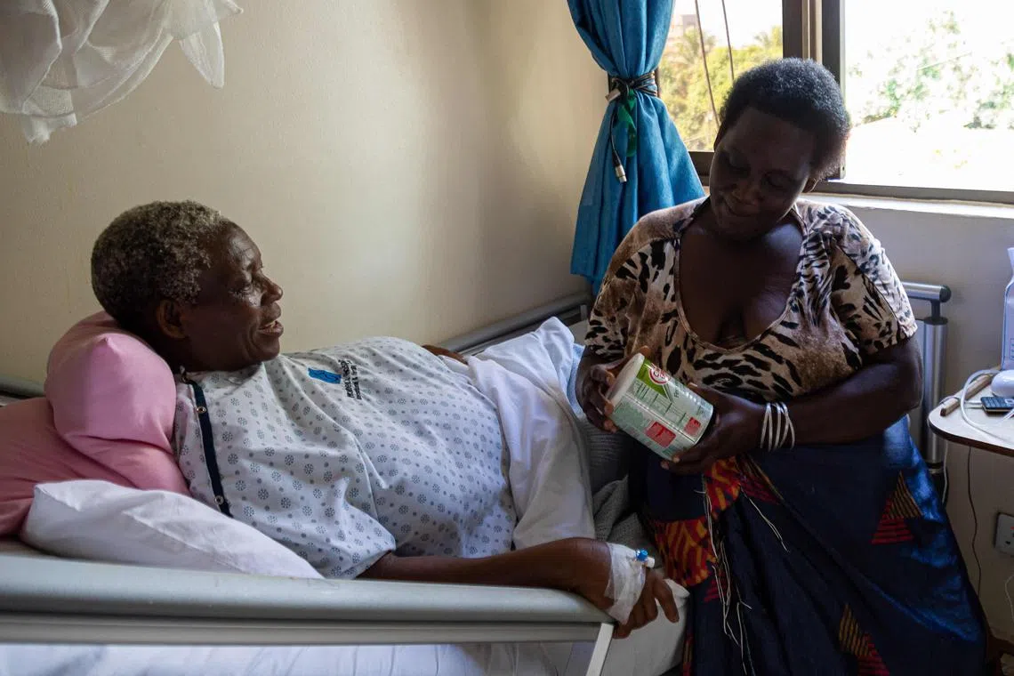 Ms Namukwaya, (L) sits on a hospital bed while receiving a gift from a well-wisher upon giving birth to twins.