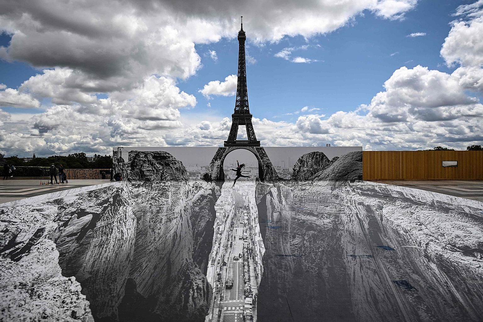 A woman jumping at Trocadero Square in front of the Eiffel Tower in Paris, where a giant artwork by award-winning French street artist and photographer Jean Rene is on display.