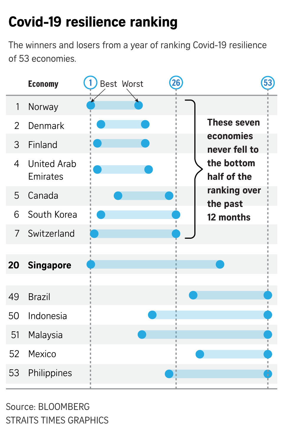 NEW YORK (BLOOMBERG) - Having weighed indicators among 53 economies for a year now, Bloomberg's Covid-19 Resilience Ranking tracked the best and worst places to be in during the pandemic, combining data ranging from outbreak control to death tolls, vaccination campaigns to progress towards restarting travel.